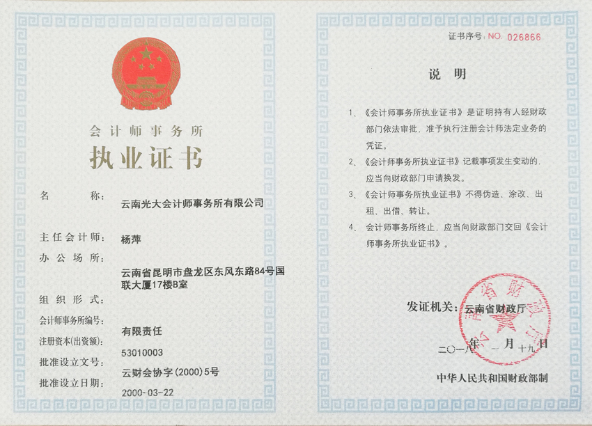 云南光大会计执业证书
